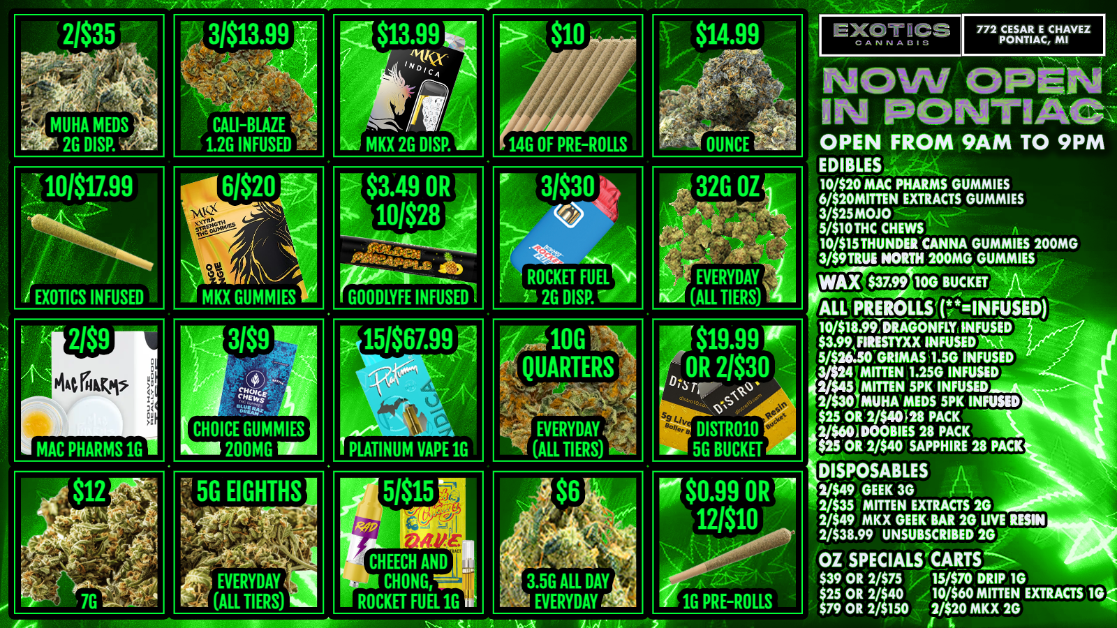 | 10/$17.99 | Exotics Infused | Infused Pre-rolls |
